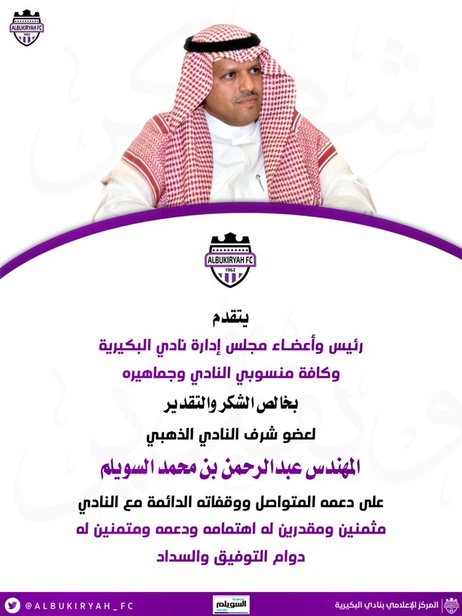 إدارة #نادي_البكيرية تقدم خالص الشكر والتقدير للعضو الذهبي المهندس عبدالرحمن السويلم، لدعمه المتواصل للنادي.