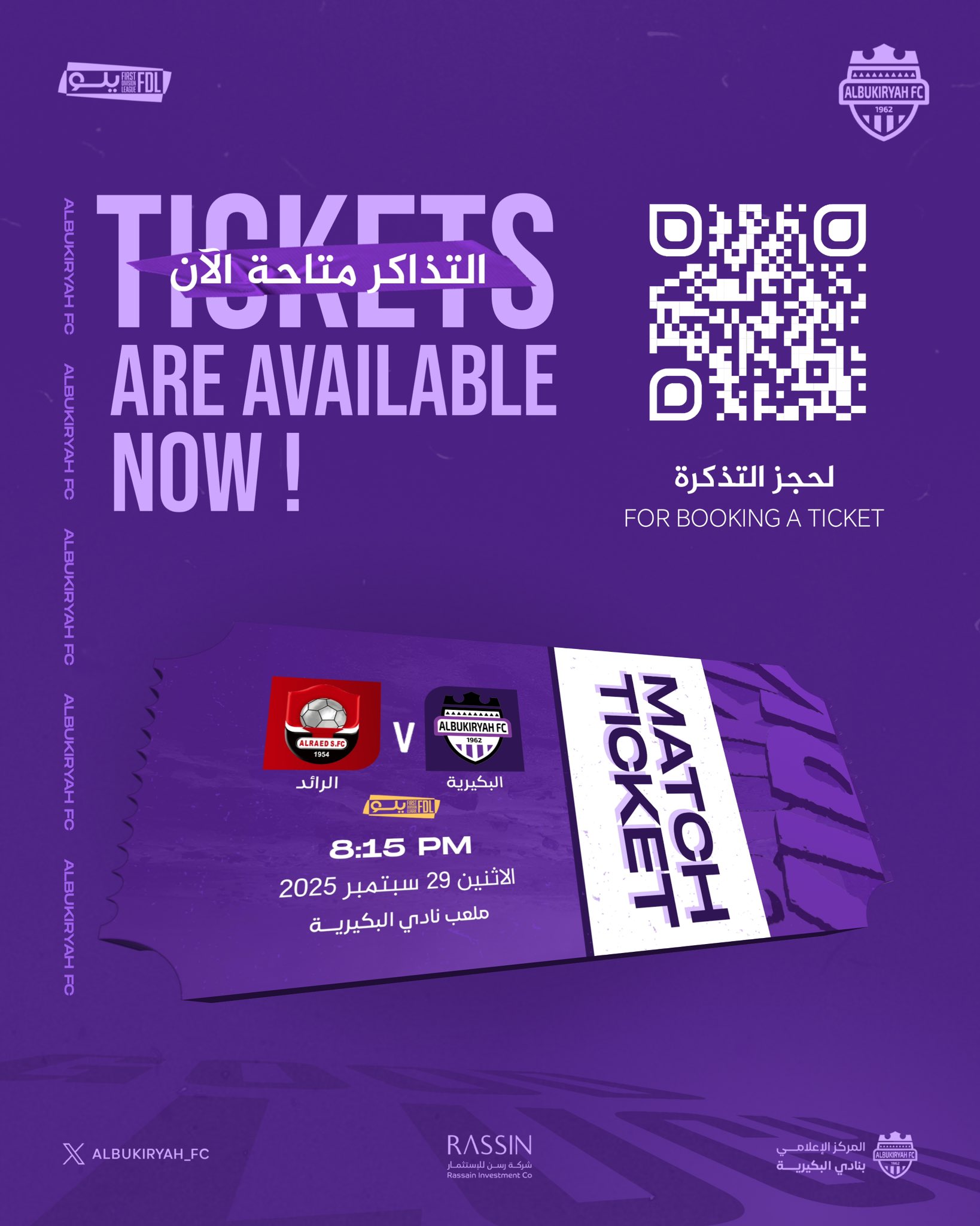 يمكنكم الحصول على تذاكر المباراة من خلال الرابط التالي: https://albukayriyah.evento.sa/home