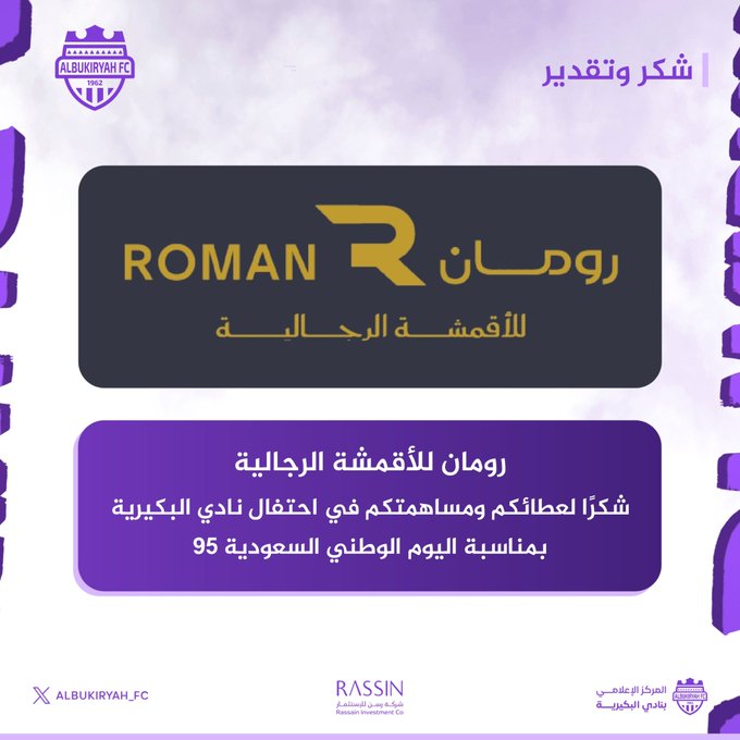 شكر وتقدير لـ ” رومان للأقمشة الرجالية ” لمساهمتهم في احتفال #نادي_البكيرية بمناسبة #اليوم_الوطني_السعودي95
